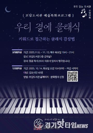 [경기핫타임뉴스=김형철 기자] 김포시 모담도서관은 클래식을 주제로 11월 6일부터 13일까지 매주 목요일 오후 7시부터 9시까지 특별 강연을 운영한다.