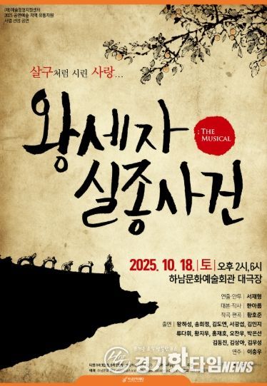 [경기핫타임뉴스=김형철 기자] (재)하남문화재단은 오는 10월 18일 오후 2시와 6시, 하남문화예술회관 대극장에서 창작 뮤지컬 '왕세자 실종사건'을 선보인다. 이번 작품은 조선 궁궐을 배경으로 벌어지는 왕세자의 갑작스러운 실종사건을 중심으로 인간의 욕망과 권력, 순수한 사랑이 교차하는 궁정 미스터리 멜로물이다. 미스터리한 사건 전개, 감성적인 서사, 다채로운 음악이 어우러져 관객들에게 눈과 귀, 머리로 즐기는 ‘3배의 재미’를 선사할 예정이다.