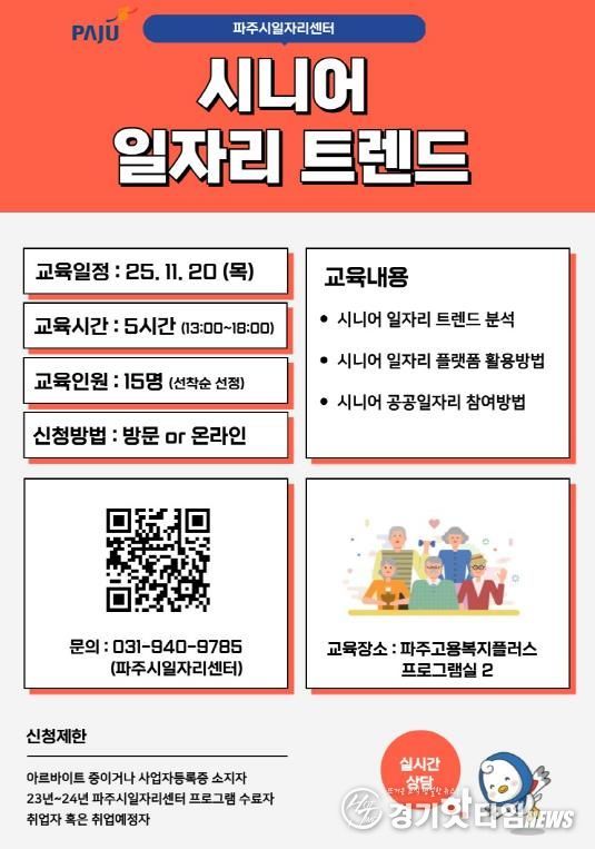 [경기핫타임뉴스=김형철 기자] 파주시는 10월 17일부터 11월 12일까지 ‘시니어 일자리 트렌드’ 교육에 참여할 교육생 15명을 모집한다.