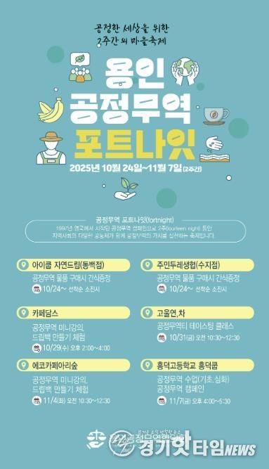 [경기핫타임뉴스=김삼영 기자] 용인특례시와 용인공정무역협의회는 10월 24일부터 11월 7일까지 2주간 용인시 공정무역 포트나잇 축제를 개최한다.