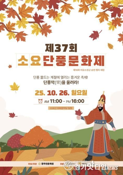 [경기핫타임뉴스=김형철 기자] 동두천시 소요산 야외음악당 일원에서 오는 10월 26일 오전 11시부터 동두천문화원이 주최하고 동두천시가 후원하는‘제37회 소요단풍문화제 및 제16회 어유소장군 행차 재현’이 열린다.