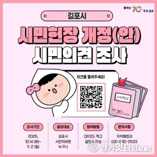 시 관계자는 “이번 개정은 단순한 문구 수정이 아니라, 김포의 현재와 미래를 함께 담아낼 새로운 시민의 약속을 만드는 과정”이라며, “시민 한 분 한 분의 목소리가 개정안에 반영될 수 있도록 적극적인 참여를 부탁드린다”고 말했다.