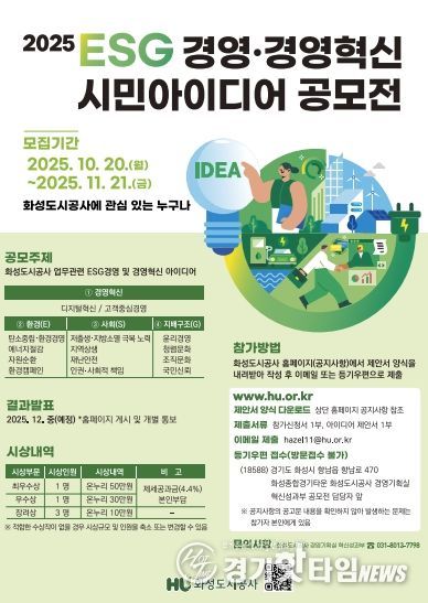 [경기핫타임뉴스=김삼영 기자] 화성도시공사는 오는 10월 20일부터 11월 21일까지 ‘2025년 ESG경영·경영혁신 시민 아이디어 공모전’을 개최한다고 밝혔다.