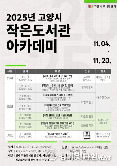 [경기핫타임뉴스=김형철 기자] 고양특례시는 관내 공·사립 작은도서관 운영자와 자원봉사자의 역량 강화를 위해 오는 11월 4일부터 20일까지 총 7회에 걸쳐‘2025년 작은도서관 아카데미’를 운영한다고 밝혔다.