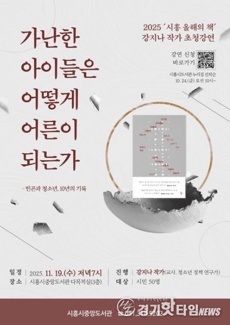 [경기핫타임뉴스=김삼영 기자] 시흥시 중앙도서관은 ‘2025년 시흥 올해의 책’으로 선정된 '가난한 아이들은 어떻게 어른이 되는가'의 저자 강지나 작가를 초청해 11월 19일 오후 7시 중앙도서관 3층 다목적실에서 시민 강연회를 개최한다.