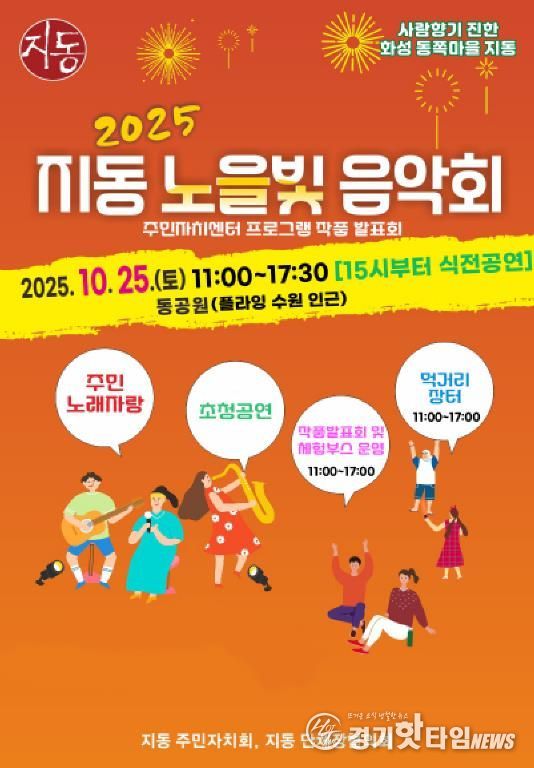 [경기핫타임뉴스=김삼영 기자] 오는 10월 25일, 수원시 팔달구 지동 동공원(지동 267-12)에서 활력 넘치는 가을날을 아름다운 음악과 주민들의 열정으로 채울 특별한 축제, ‘2025 지동 노을빛 음악회·주민자치센터 작품발표회’가 열린다.