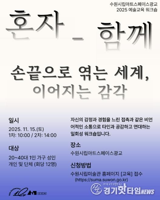 [경기핫타임뉴스=김삼영 기자] 경기도 수원시립미술관은 예술을 통해 타인과의 관계를 확장하고 감각을 회복하는 예술교육 워크숍 '혼자-함께'를 11월 15일 수원시립아트스페이스광교에서 개최한다.