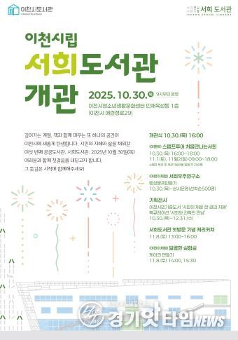 [경기핫타임뉴스=김형철 기자] 이천시는 오는 10월 30일, 시민들의 지식과 문화 향유를 위한 새로운 공간인 ‘이천시립서희도서관’을 공식 개관한다고 밝혔다.