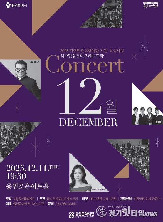 [경기핫타임뉴스=김삼영 기자] 용인문화재단은 오는 12월 11일 오후 7시 30분, 용인포은아트홀에서 웨스턴심포니오케스트라 '콘서트 ‘12월’' 공연을 개최한다.