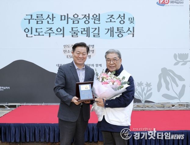 시는 14일 구름산 산림욕장에서 대한적십자사 경기도지사와 함께 개최한 ‘마음정원 조성 및 인도주의길 개통식’에서 이 회장에게 광명시 명예시민증을 수여했다.