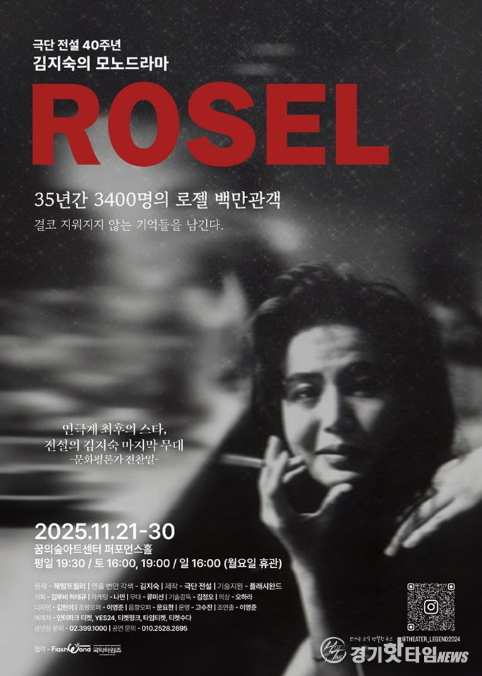 [경기핫타임뉴스=김형철 기자] 극단 전설 40주년 기념작이자 배우 김지숙의 마지막 공연인 모노드라마 〈로젤〉이 오는 11월 21일부터 30일까지 꿈의숲아트센터 퍼포먼스홀에서 막을 올린다. 35년간 3,400회 이상 공연되며 백만 명이 넘는 관객을 울린 이 작품은 여성의 주체성과 인간성의 회복을 그린 한국 연극사의 대표작으로 꼽힌다.