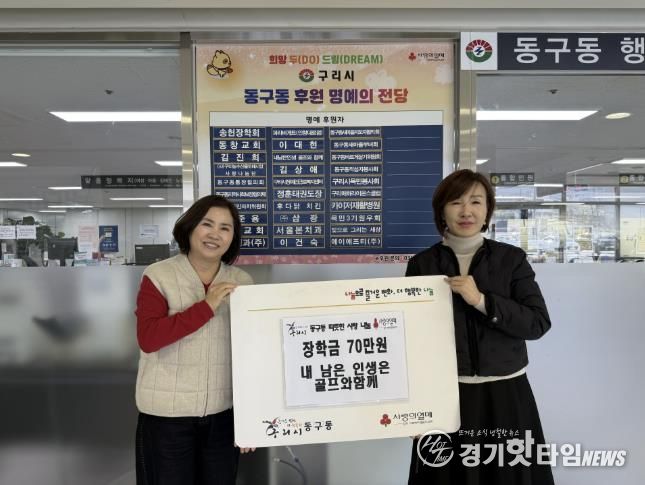 [경기핫타임뉴스=김형철 기자] 구리시 동구동 행정복지센터는 지난 18일 동구동 행정복지센터 대회의실에서 '내 남은 인생은 골프와 함께' 모임으로부터 관내 취약계층 청소년을 위한 장학금 70만 원을 기탁받았다고 밝혔다.