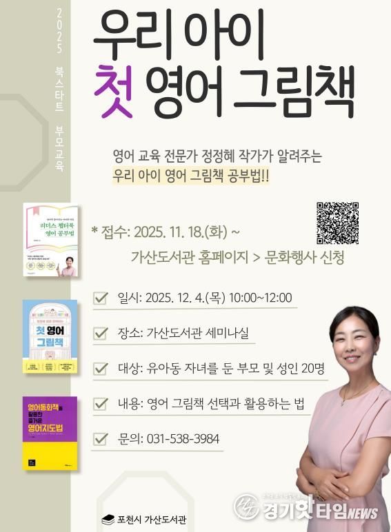 [경기핫타임뉴스=김형철 기자] 포천시는 오는 12월 4일 가산도서관에서 ‘우리 아이 첫 영어 그림책’을 주제로 2025 북스타트 부모교육을 운영한다.