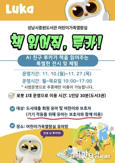 [경기핫타임뉴스=김삼영 기자] 성남도시개발공사 중원도서관은 지역 어린이들에게 인공지능(AI) 기술을 활용한 새로운 독서 체험 기회를 제공하기 위해 ‘책 친구 로봇, 루카(LUKA)’를 오는 12월까지 운영한다고 21일 밝혔다.