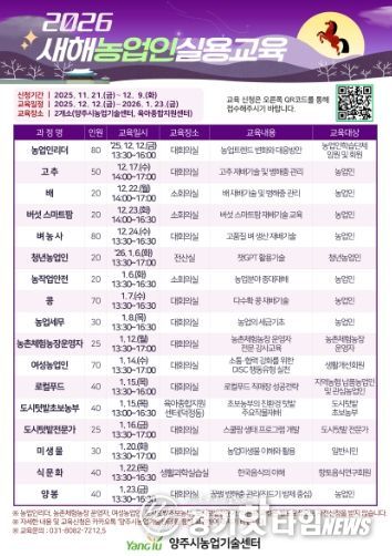 [경기핫타임뉴스=김형철 기자] 양주시가 변화하는 농업환경에 대응하고 농업인의 현장 문제 대응 능력을 높이기 위해 ‘2026년 새해농업인실용교육’ 교육생을 모집한다.