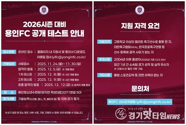 [경기핫타임뉴스=김삼영 기자] 용인FC가 잠재력 높은 유망주 발굴을 위해 오는 12월 8일(월)부터 9일(화)까지 이틀간 용인시청소년수련원에서 공개테스트를 진행한다.