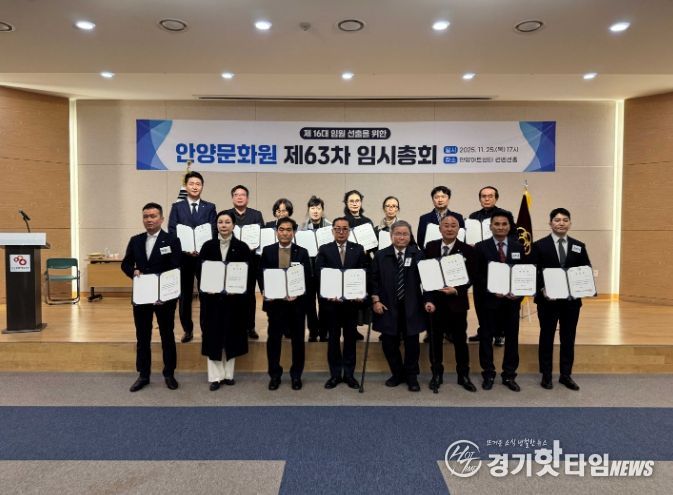 [경기핫타임뉴스=김삼영 기자] 안양문화원은 지난 25일 오후 5시 안양아트센터 컨벤션홀에서 제63차 임시총회를 열고 임기 만료(2025.12.26.)에 따른 제16대 원장 및 임원 선출을 진행했다. 이번 임시총회는 정관에 따른 성원이 충족되어 개회됐으며, 원장·부원장·이사·감사에 대한 선출 절차가 공정한 절차에 따라 실시됐다.