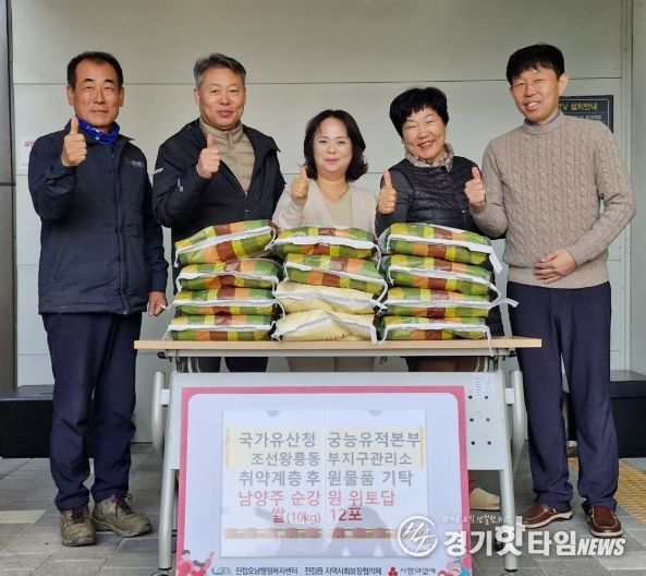 [경기핫타임뉴스=김형철 기자] 남양주시는 26일, 국가유산청 조선왕릉동부지구관리소가 진접읍 내각리에 위치한 순강원의 위토답에서 직접 수확한 쌀 10㎏ 12포를 진접읍 지역사회보장협의체에 기탁했다고 밝혔다. 순강원은 조선 선조의 후궁인 인빈 김씨의 무덤이며, 위토답은 능의 제사나 관리에 필요한 비용을 충당하기 위해 마련된 토지다.