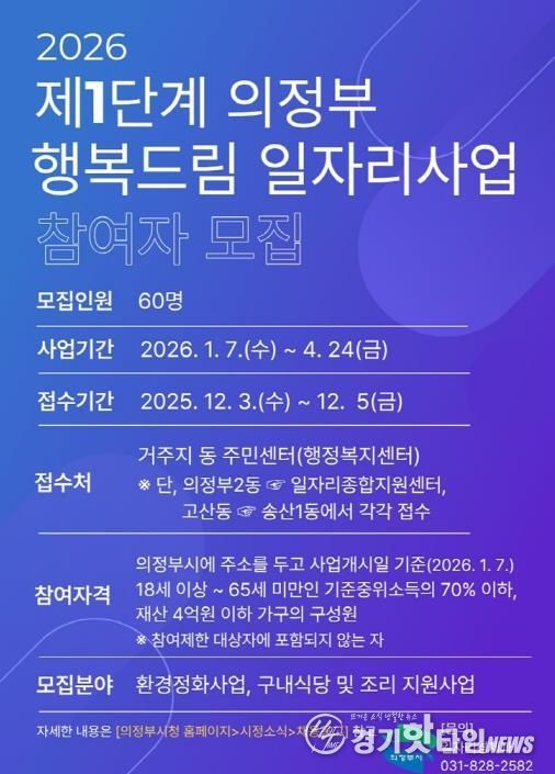 [경기핫타임뉴스=김형철 기자] 의정부시는 12월 3일부터 5일까지 ‘2026년 제1단계 의정부 행복드림 일자리사업’ 참여자 60명을 모집한다.