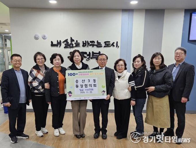 [경기핫타임뉴스=김형철 기자] 의정부시 송산3동행정복지센터는 11월 25일 송산3동 통장협의회가 ‘100일간 사랑릴레이 배턴 잇기’에 동참해 성금 150만 원을 기탁했다고 밝혔다.