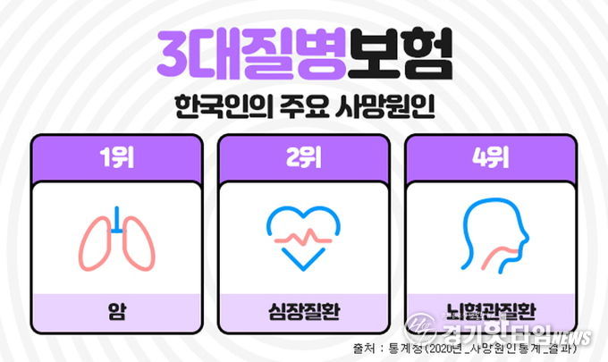 [경기핫타임뉴스=김형철 기자] 한국인의 주요 사망원인중에 암, 뇌혈관질환, 심혈관질환은 흔히 3대질병이라 일컬어지며 살아가면서 가장 먼저 대비해야 하는 중대질병으로 항상 강조되고 있다. 이들 질병에 미리 대비하기 위해 가입하는 것이 진단비보험인데, 이러한 3대질병진단비를 중점으로 보장하는 보장성보험이 3대진단비보험 이다. 3대질병진단비보험은 각각의 질병에 주목해서 보장하기도 하지만, 나에게 맞는 추가 특약을 잘 골라서 가입한다면 종합건강보험으로도 충분히 활용도가 높다.