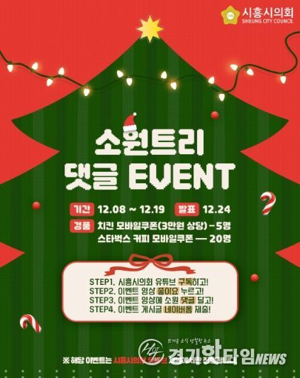 [경기핫타임뉴스=김삼영 기자] 경기 시흥시의회가 다가오는 성탄절을 맞아 시민들과 따뜻한 마음을 나누고 소통을 강화하기 위해 ‘소원트리 댓글 이벤트’를 진행한다.