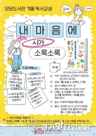 [경기핫타임뉴스=김형철 기자] 김포시 모담도서관은 12월 방학을 맞아 어린이를 대상으로 1월 13일부터 1월 16일까지 겨울 독서교실 ‘내 마음에 시가 소록소록’을 진행한다.