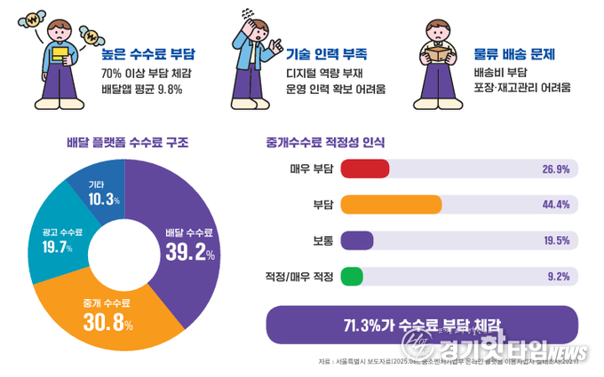 소상공인이 온라인 플랫폼을 활용하는 데 가장 큰 걸림돌은 여전히 수수료 부담이다. 중소벤처기업부 조사에 따르면, 소상공인의 71.3%가 수수료를 ‘부담’ 또는 ‘매우 부담’스럽다고 응답했으며 ‘적정하다’는 응답은 9.2%에 불과했다. 특히 배달 플랫폼의 수수료 비중은 전년 대비 6.9%p 상승한 것으로 나타나, 온라인 진출에 따른 고정비 부담이 더욱 커지고 있음을 시사했다.