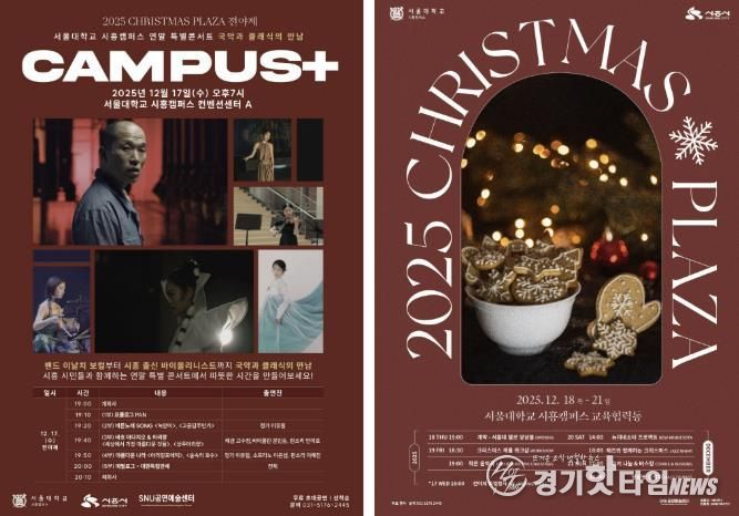 [경기핫타임뉴스=김삼영 기자] 시흥시와 서울대학교 시흥캠퍼스가 오는 12월 17일부터 21일까지 특별 행사인 ‘2025 크리스마스 플라자(CHRISTMAS PLAZA)’를 개최한다. 올해 행사는 단 하루만 열리는 전야제 특별콘서트 ‘캠퍼스 플러스’를 중심으로, 국악과 클래식을 대표하는 최정상급 연주자들이 한자리에 모여 연말 분위기를 고조시킬 예정이다.