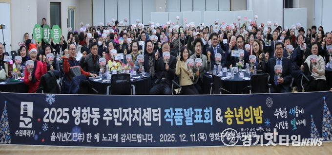 [경기핫타임뉴스=김삼영 기자] 수원시 장안구 영화동은 지난 11일, 동 행정복지센터 3층 대강당에서 한 해 동안 갈고닦은 실력을 뽐내고 올 한 해를 돌아보는 ‘2025 영화동 주민자치센터 작품발표회 & 송년의 밤’을 개최했다.