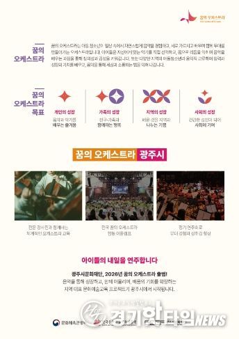 [경기핫타임뉴스=김삼영 기자] (재)광주시문화재단은 문화체육관광부가 주최하고 한국문화예술교육진흥원이 주관하는 ‘2026 꿈의 오케스트라 운영사업’에서 예비 거점기관 단계를 거쳐 최종 신규 거점기관으로 선정됐다고 22일 밝혔다.