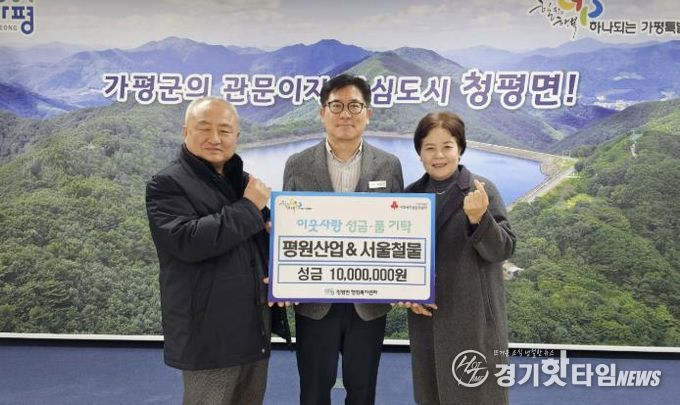[경기핫타임뉴스=김형철 기자] 가평군에 소재하는 평원산업과 서울철물은 최근 지역 내 어려운 이웃을 위한 성금 1,000만 원을 청평면 행정복지센터에 기탁하며 따뜻한 나눔을 실천했다.
