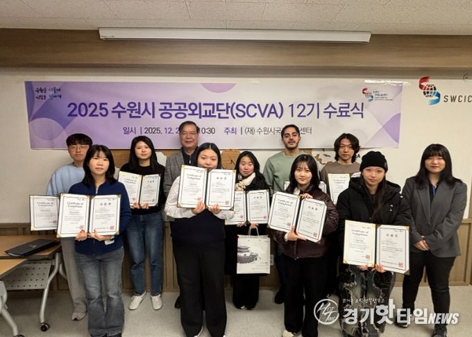 [경기핫타임뉴스=김삼영 기자] 수원시국제교류센터가 22일 센터에서 ‘수원시 공공외교단(SCVA) 12기’ 수료식을 열고, 단원 16명에게 수료증을 전달했다. 우수활동자 4명에게는 상장을 수여했다.