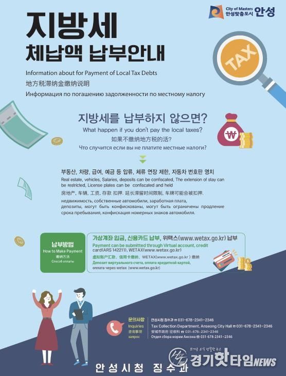 지난달 기준, 안성시의 외국인 지방세 체납자는 1,014명, 체납액은 2억 7천여만 원에 달한다. 이에 따라 시는 거소지가 불확실하거나 납부 의지가 없는 외국인 체납자 723명에 대하여 외국인 전용보험 자료를 조회 의뢰한 후, 15명에 대하여 압류 조치를 시행했다.