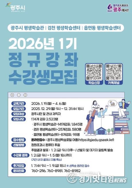 [경기핫타임뉴스=김삼영 기자] 광주시는 12월 29일부터 31일까지 평생학습관, 검천평생학습센터 및 읍면동 평생학습센터에서 운영하는 2026년 제1기 평생학습 프로그램 수강생을 모집한다고 26일 밝혔다.