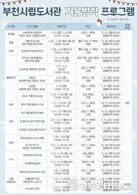 [경기핫타임뉴스=김형철 기자] 부천시는 겨울방학을 맞아 내년 1월부터 2월까지 부천시립도서관에서 전 연령을 대상으로 독서문화 프로그램과 행사를 운영한다고 30일 밝혔다. 이번 프로그램은 연령과 관심사에 따라 다양한 참여 기회를 제공하기 위해 마련됐다.