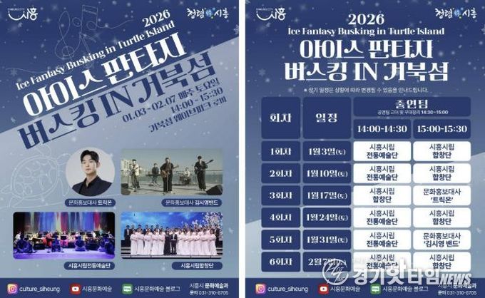[경기핫타임뉴스=김삼영 기자] 시흥시는 지난 연말에 진행된 ‘2025 시흥 사운드 오브 윈터’의 열기를 잇는 후속 문화예술 프로그램으로, 겨울철 거북섬을 찾는 시민과 관광객에게 풍성한 즐길 거리를 제공하고자 ‘2026 아이스 판타지 버스킹 인 거북섬’을 운영한다.