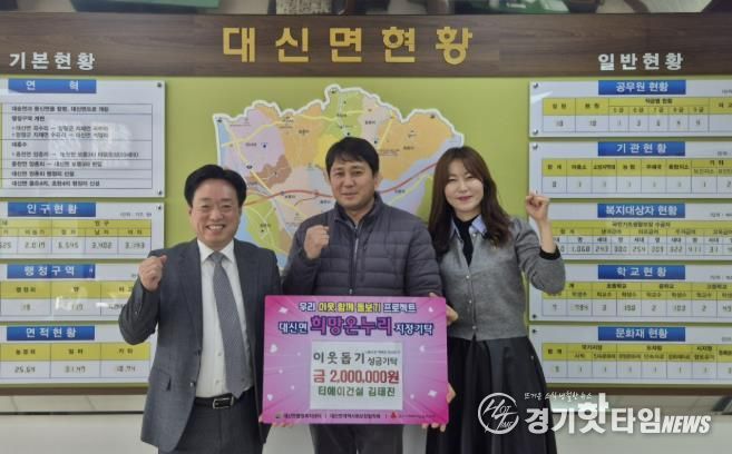 [경기핫타임뉴스=김형철 기자] 지난 2일 티에이건설 김태진 대표가 관내 어려운 이웃을 위해 사용해 달라며 이웃돕기 성금 200만원을 대신면 행정복지센터에 기탁했다.