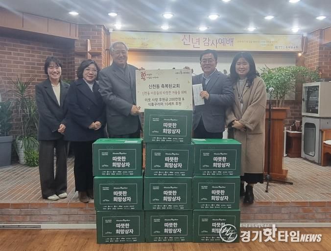 [경기핫타임뉴스=김삼영 기자] 시흥시 신천동 행정복지센터에 지난 1월 5일 신천동 축복된교회가 방문해 성탄 감사헌금 200만 원과 희망상자(식품꾸러미) 10개를 전달하며 지역사회에 이웃 사랑을 실천했다.