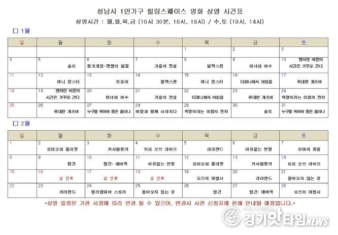 [경기핫타임뉴스=김삼영 기자] 성남시는 오는 2월 28일까지 1인 가구 힐링 스페이스 커뮤니티 홀(중원구 둔촌대로 100 4층)에서 ‘추억의 할리우드 영화’를 총 120회 무료 상영한다.