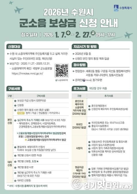 [경기핫타임뉴스=김삼영 기자] 수원특례시는 2월 27일까지 ‘2026년 군소음 피해보상금’ 신청을 받는다.