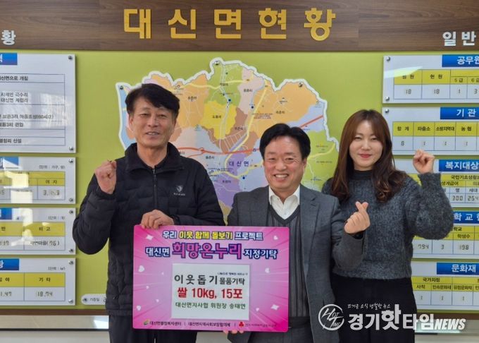 [경기핫타임뉴스=김형철 기자] 지난 7일 대신면 지역사회보장협의체 송태연 위원장은 직접 재배하고 수확한 쌀 10kg 15포를 지역 내 어려운 이웃을 위해 사용해 달라며 대신면 행정복지센터에 기부하며 따뜻한 나눔을 실천했다.