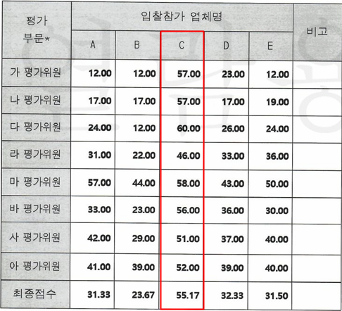특정 평가위원들이 C 업체에는 정성적 평가의 만점인 60점에 육박하는 점수를 부여하고 경쟁업체들에게는 비정상적으로 낮은 점수(12점~19점)를 부여하면서 입찰가격 점수의 차이를 뒤집을 정도의 정성평가 격차가 발생했고, 이는 평가위원들의 심사가 객관적 근거가 없는 자의적, 인위적인 것으로 공정한 평가의 재량을 벗어났다는 게 신청인의 또 다른 주장이다.