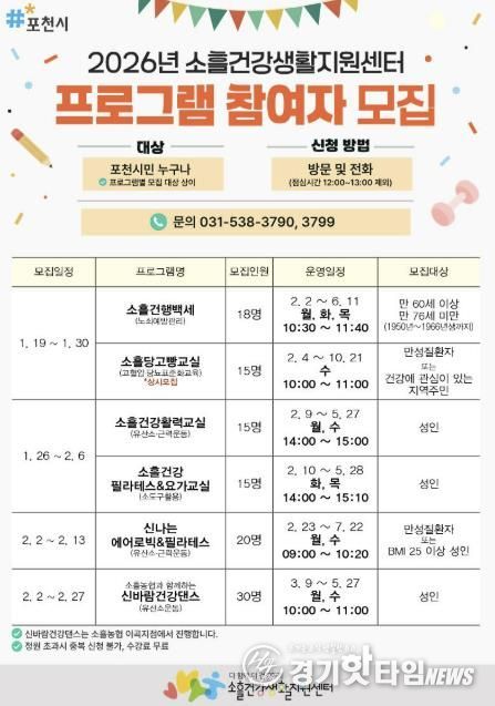 [경기핫타임뉴스=김형철 기자] 포천시 소흘건강생활지원센터는 시민들의 건강 증진과 활기찬 일상 지원을 위해 오는 19일부터 ‘2026년 상반기 건강증진 프로그램’ 참여자를 모집한다.