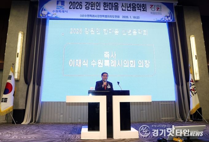 [경기핫타임뉴스=김삼영 기자] 수원특례시의회는 1월 16일수원컨벤션센터에서 열린 '2026 강원인 한마음 신년음악회'에 참석했다. 이번 행사는 수원특례시 강원특별자치도민회가 주최한 신년 행사로, 이재식 의장을 비롯한 내빈과 강원 출신 시민 등 약 250여 명이 참석한 가운데 신년음악회, 표창 수여, 만찬 등의 순서로 진행됐다.