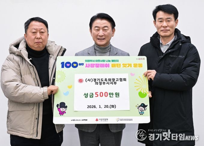[경기핫타임뉴스=김형철 기자] 의정부시는 1월 20일 (사)경기도옥외광고협회 의정부시지부가 ‘100일간 사랑릴레이 배턴 잇기’에 동참해 성금 500만 원을 기탁했다고 밝혔다.