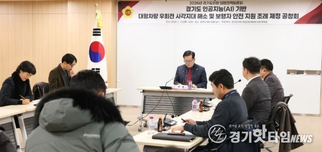 [경기핫타임뉴스=김삼영 기자] 경기도의회 건설교통위원회 허원 위원장(국민의힘·이천2)은 19일 경기도의회 중회의실에서 '경기도 인공지능(AI) 기반 대형차량 우회전 사각지대 해소 및 보행자 안전 지원 조례' 제정을 위한 공청회를 개최했다.