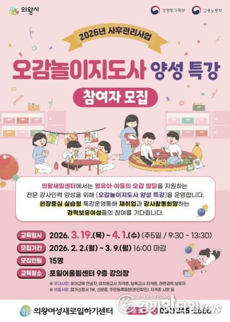[경기핫타임뉴스=김삼영 기자] 의왕시 여성새로일하기센터가 '오감놀이지도사 양성 특강'의 교육생을 모집한다.