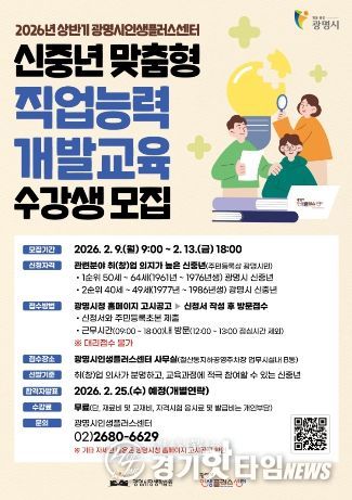 [경기핫타임뉴스=김삼영 기자] 광명시 인생플러스센터는 신중년의 취업 경쟁력을 높이고 성공적인 인생 재도약을 지원하기 위해 오는 13일까지 ‘2026년 상반기 신중년 맞춤형 직업능력개발교육과정’ 수강생을 모집한다.