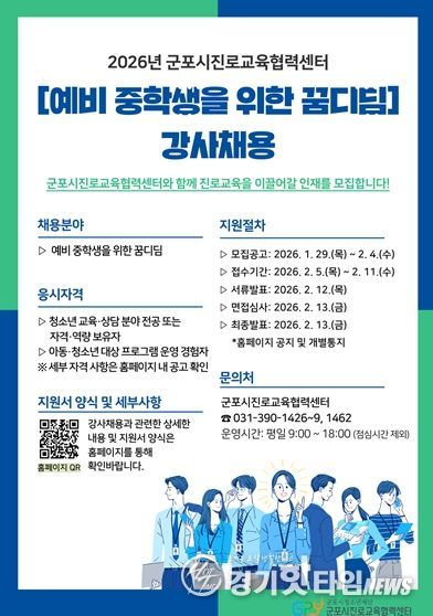 [경기핫타임뉴스=김삼영 기자] (재)군포시청소년재단 군포시진로교육협력센터는 관내 예비중학생의 학교 적응과 진로 기초 역량 강화를 위해 '2026년 군포시진로교육협력센터 예비중학생을 위한 꿈디딤' 프로그램에 참여할 강사를 채용한다고 밝혔다.